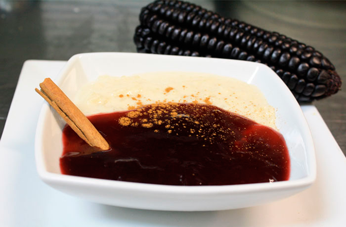 Es la combinación perfecta entre dos postres, por una lado está el maíz morado concentrado con fécula y por el otro el tradicional arroz con leche.